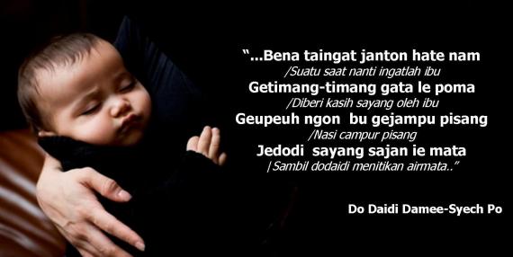 Lalu bagaimana jika si buah hati masih berusia di bawah satu tahun? Di Nanggroe Aceh Darusallam (saya kira di tempat lain juga ada) terdapat kebiasaan bagi seorang ibu untuk memberikan nasehat kepada bayi-bayi mereka melalui syair-syair yang disebut do daidi. Sebuah syair peninabobo bayi, semacam syair sejuk pengantar tidur.
