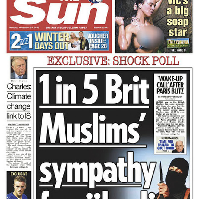 The Sun juga mendulang kemarahan di sosial media karena melaporkan hasil survei itu dengan judul berita utama halaman depan edisi Senin (23/11) bertajuk: "1 in 5 Brit Muslims' sympathy for jihadis".