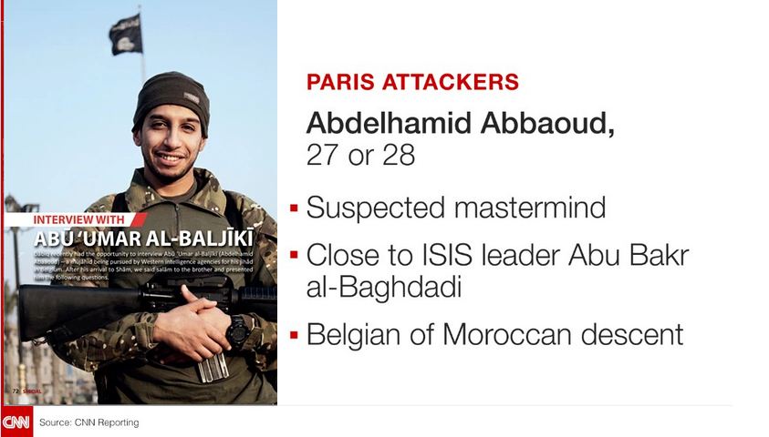 Tersangka otak serangan Paris adalah warga Belgia didgua bernama Abdelhamid Abaaoud, pria berusia 28 tahun keturunan Maroko, yang dalam dua tahun silam ini dikaitkan dengan berbagai pejuang Islam di Eropa selain merekrut para kombatan di Eropa.