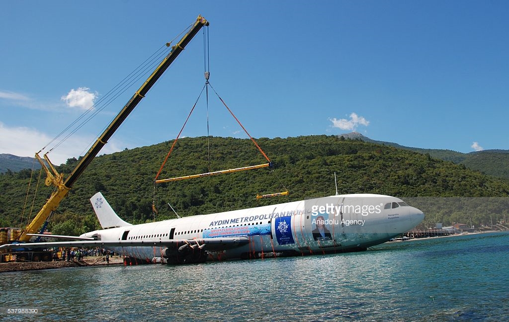 Pesawat raksasa itu ditenggelamkan ke dasar laut pada Sabtu sore (4/6) di resor Kusadasi di Provinsi Aydin menurut siaran kantor berita Dogan dan Cihan pada Minggu (5/6).